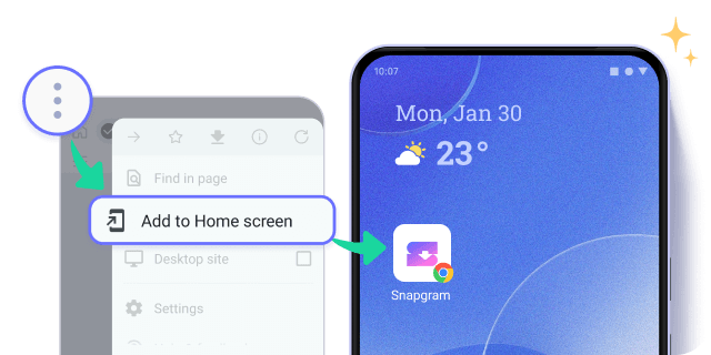 Get one-click access to our Instagram downloader. It works just like an app and makes your next download even faster.